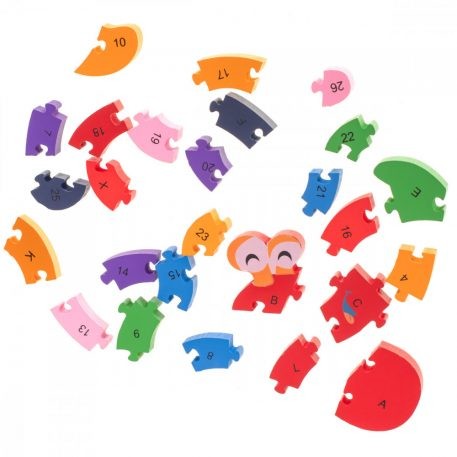 Das Puzzle hilft, logisches Denken zu entwickeln und Zahlen und Buchstaben zu lernen. Das Spielzeug bestehend aus 26 farbigen Teilen.