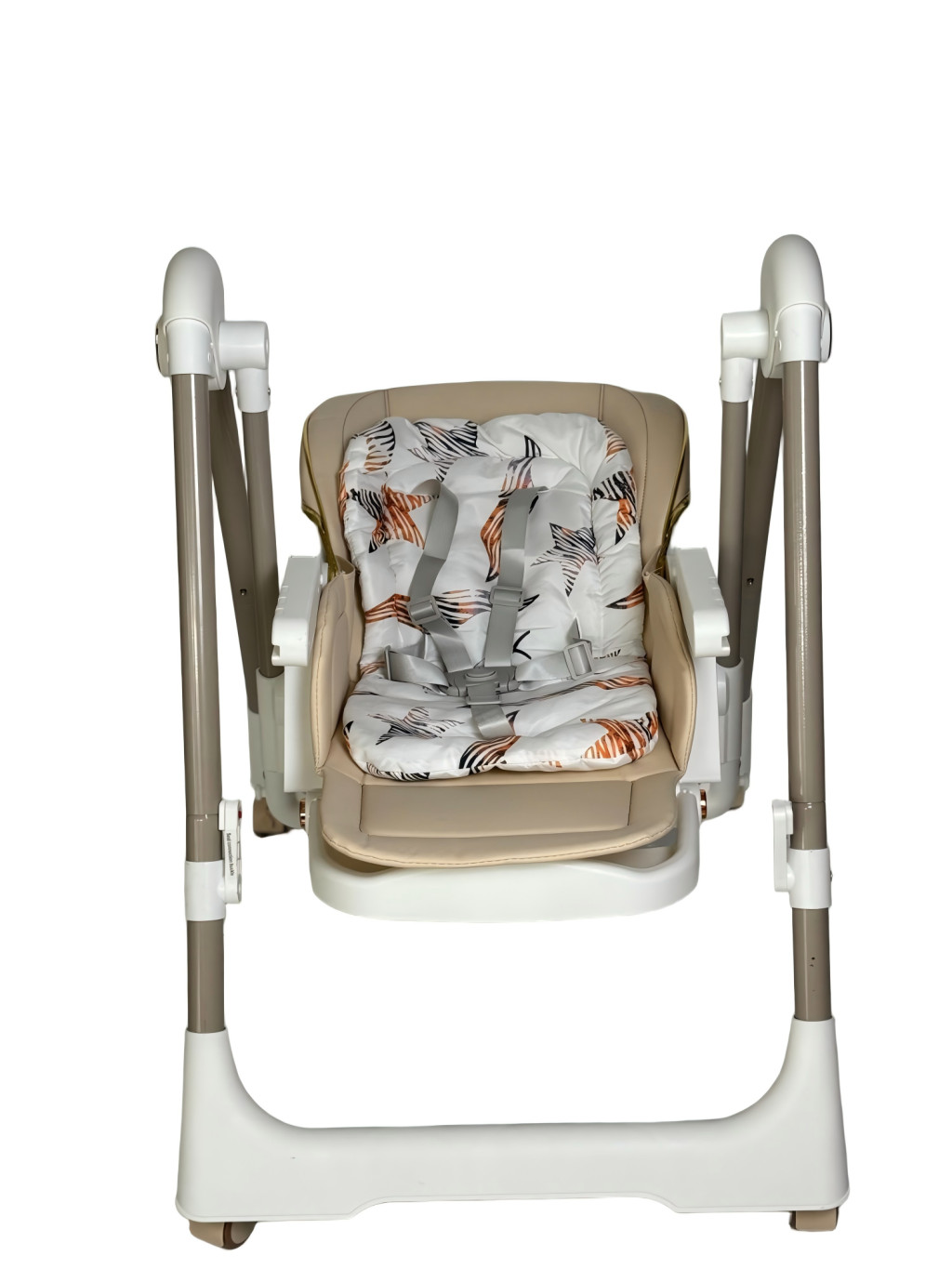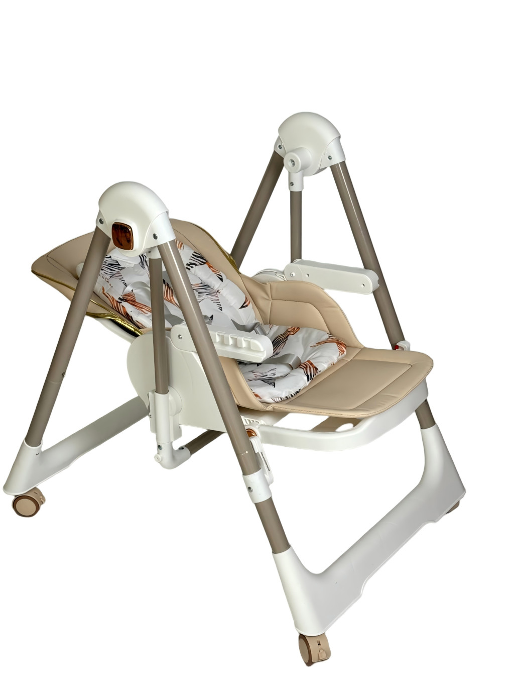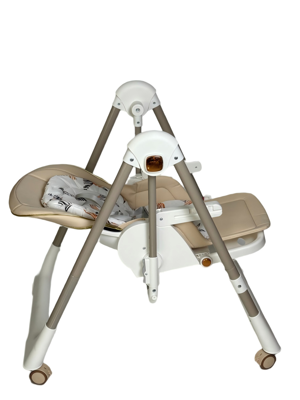 Das robuste Gestell bietet Stabilität, die vier Beine sind mit Gummirädern ausgestattet, die gebremst werden können. Dank der Räder lässt sich der Hochstuhl frei bewegen, ohne den Boden zu beschädigen. Zudem kann er leicht in eine Schaukel umgewandelt werden, die maximalen Komfort für das Baby bietet.